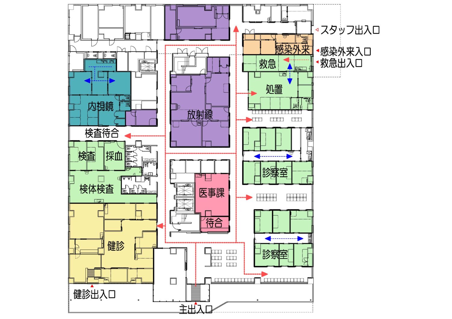 :一般外来、小児外来、手術・検査などの動線が交わらないよう配慮します。