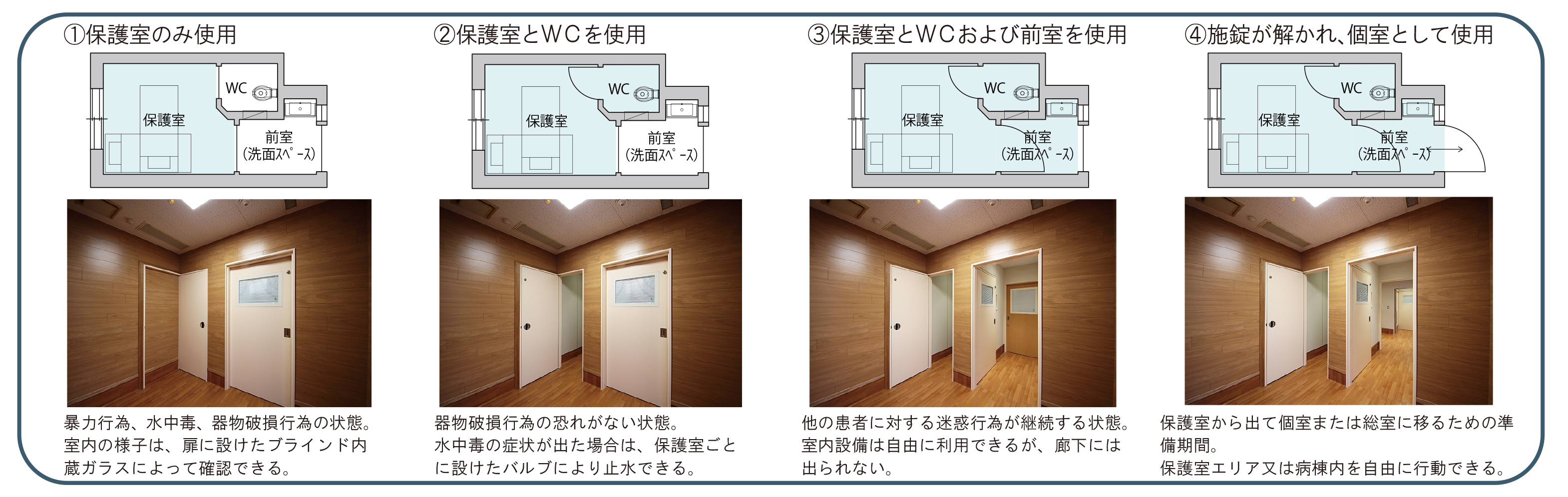 扉で前室・WCとの関係を切り替えられる構成にしておくと、室内の使い方を状況に応じて変えやすくなり、保護室内の見守りと対応にも無理が生じにくくなります。