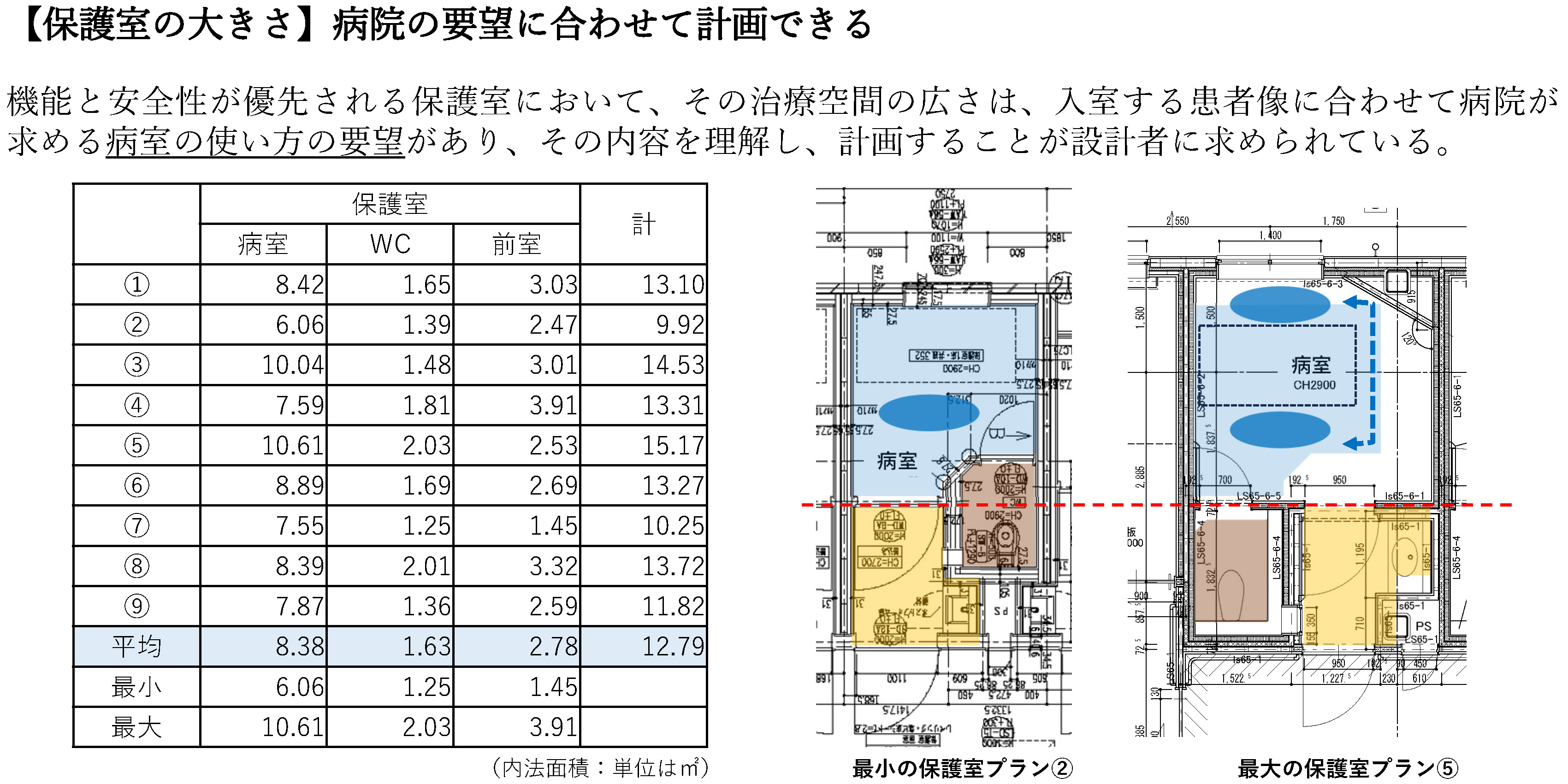 ゆう建築設計では、保護室を単体としてではなく、病棟内での位置付けや救急時の対応も含めて計画します。そのうえで、患者の状態に応じて安全配慮の段階を切り替えられるよう、保護室・前室(洗面スペース)・WCの間それぞれに建具を設けています。各建具は施錠可能で、扉の開閉によって室内の使い方を状況に応じて調整できる平面計画としています。