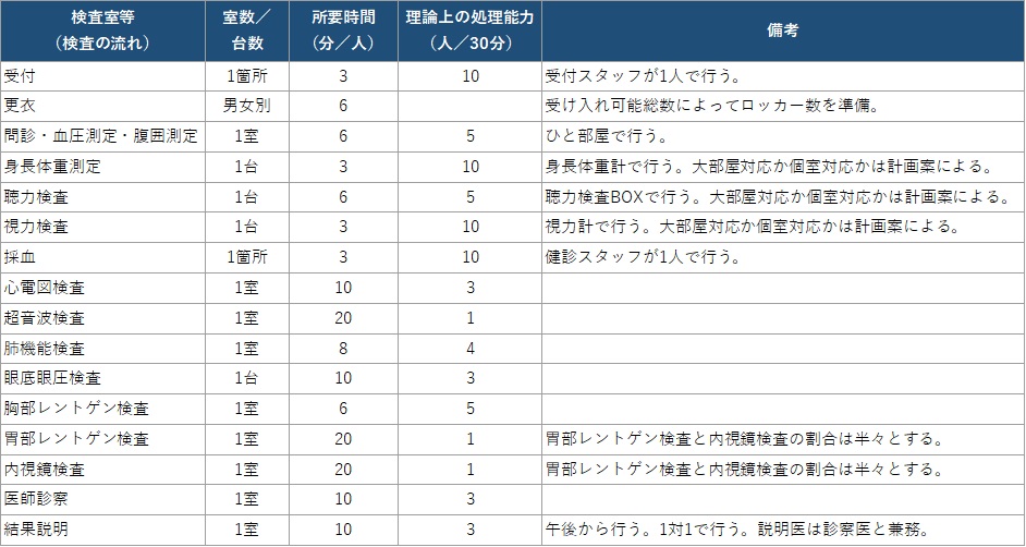 健診施設計画の第一歩は、特定の部屋を増やす/減らすという議論ではありません。施設規模に関わらず、健診コース、検査室数と所要時間を想定し、30分単位の処理能力から受入枠を仮設定します。