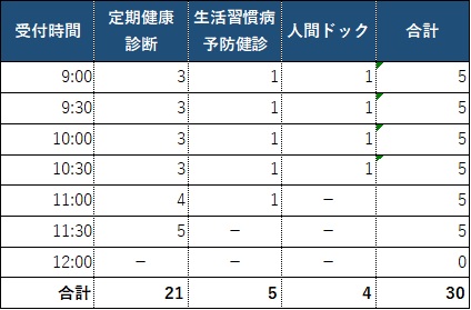 例えば超音波検査を「30分に1人」の枠で見立てると、人間ドックの受付枠も同様に「30分に1人」となり、検査目標時間を120分とした場合、受付9:00~11:00で理論上は5枠が上限となります。
