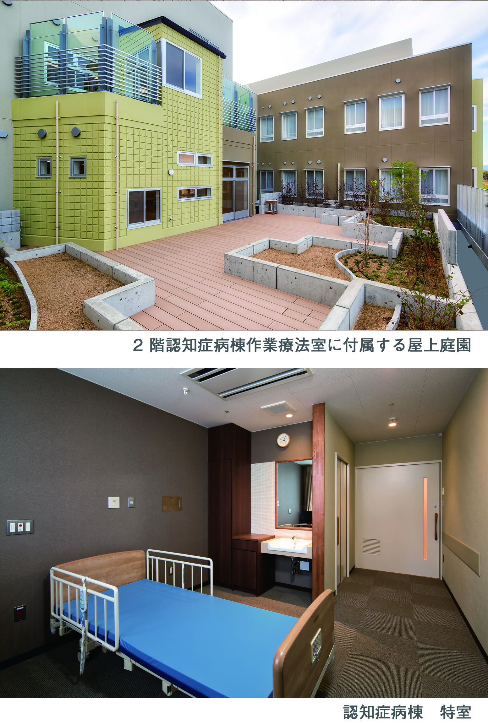 全体的な入院患者の高齢化に伴い、療養病棟に限らず一般閉鎖病棟でも認知症の患者が増えています。条件の良い部屋のニーズがあるため個室を複数設けてあり、レスパイト対応として特室の需要が高くトイレ付のお部屋を2 室用意しました。