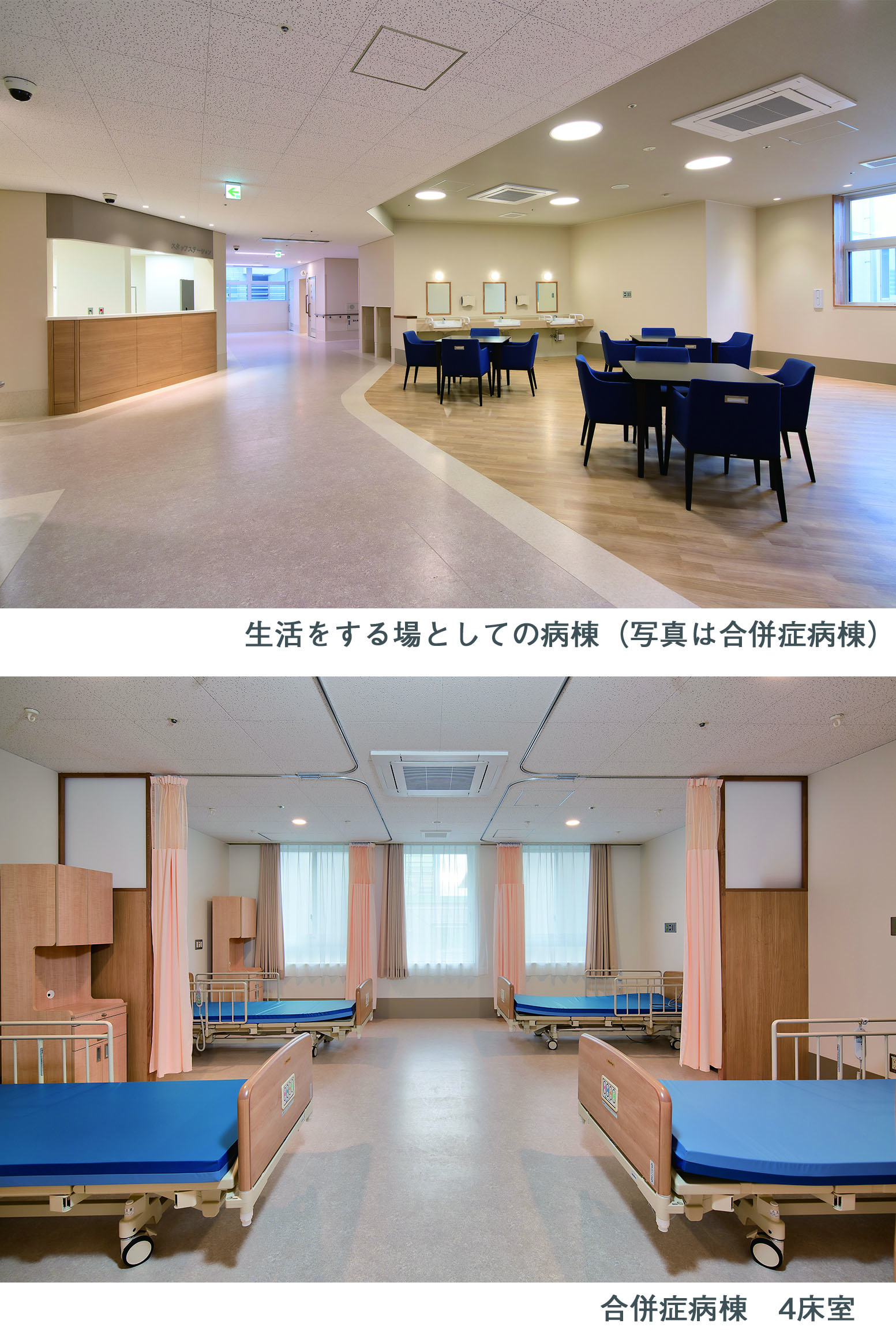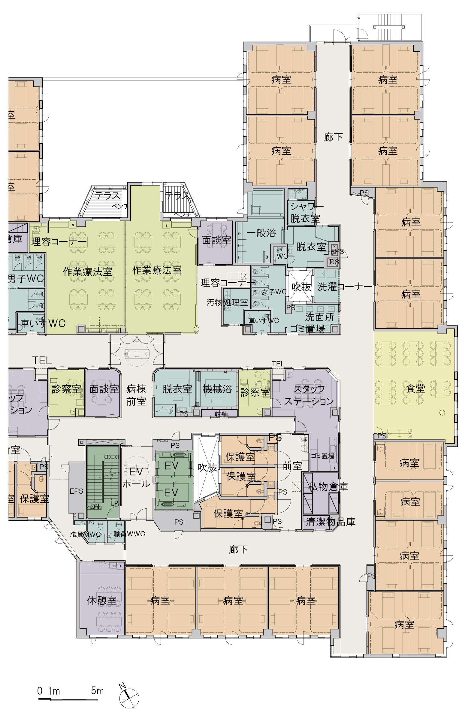 建替前からある程度の病棟分けはされていたのですが、様々な症状・身体機能に合わせたソフト+ハードの対応が難しい状況にありました。このたびの建替では4つの病棟の要件を明確にし、その人に適した病棟で入院生活を送ることができるように整備を行いました。
