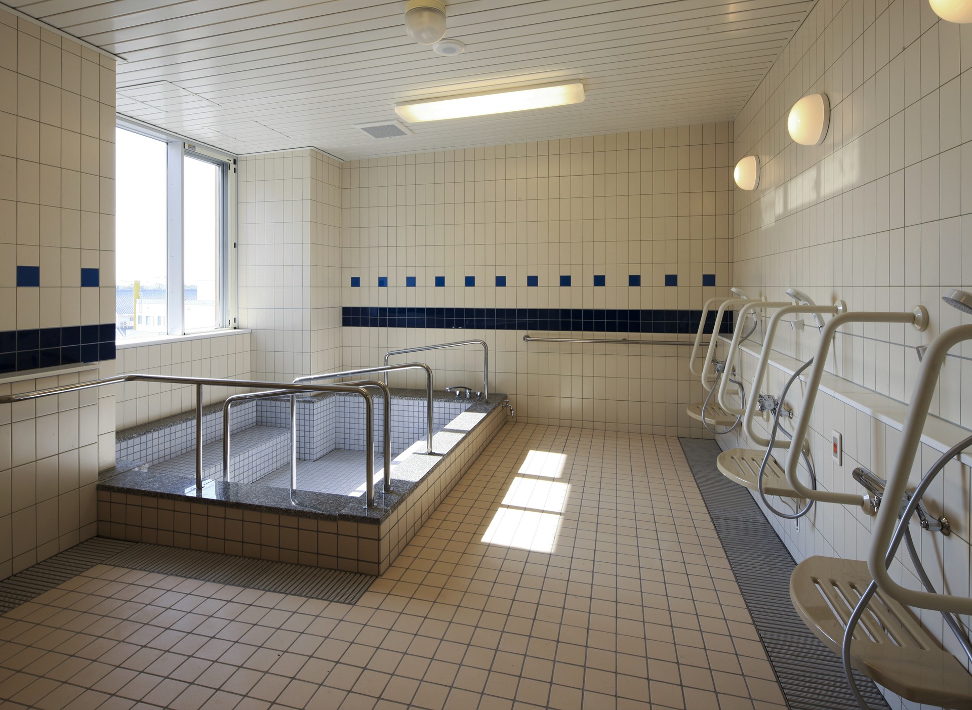 さらに浴室については、将来介助が必要な患者が増えることを想定し、2階の浴室を「一般浴室2室」から「一般浴室2室+機械浴室」へ変更できるよう、壁の位置・出入り口の位置・排水溝の位置などをあらかじめ工夫しています。福祉施設のように最初から高齢者の居住を前提とするのではなく、住宅のように同じ患者が同じ場所で生活を続けることが多い精神科病院において、運用の将来変化を建築側で受け止めるための可変対応と言えます。