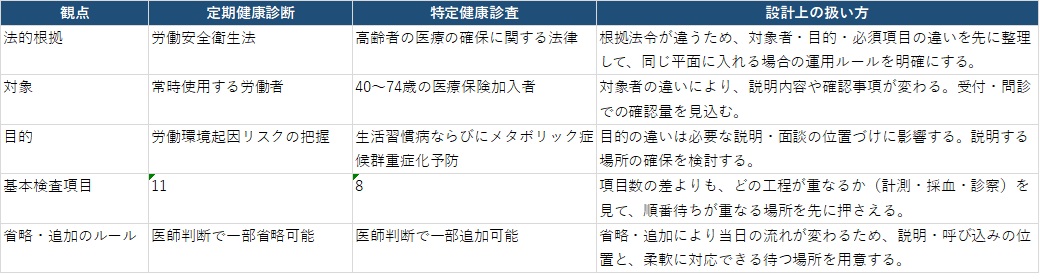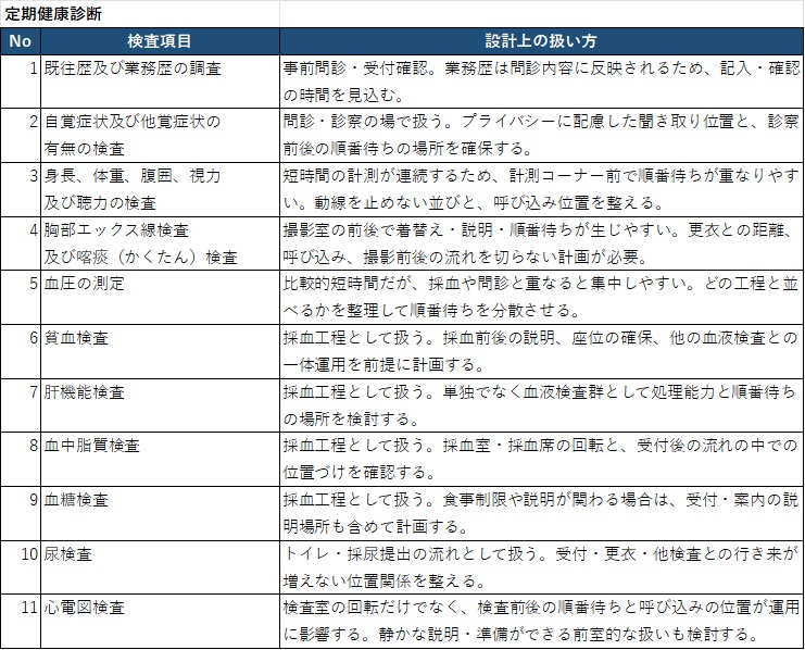 法定健診は、対象者や実施の根拠が比較的はっきりしているため、計画の前提をそろえやすい領域です。ここで設計者が先に確認するのは、制度の知識そのものではなく、制度の違いが建物の使われ方にどう表れるかです。