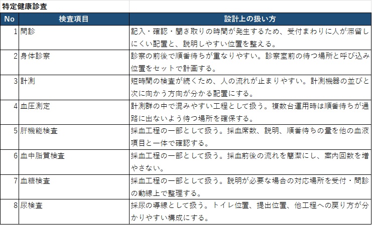 特定健診では、確認や説明が必要な場面が出てきます。設計では、説明する場所が通路際や受付前にならないように、あらかじめ位置を決めておくことが重要です。