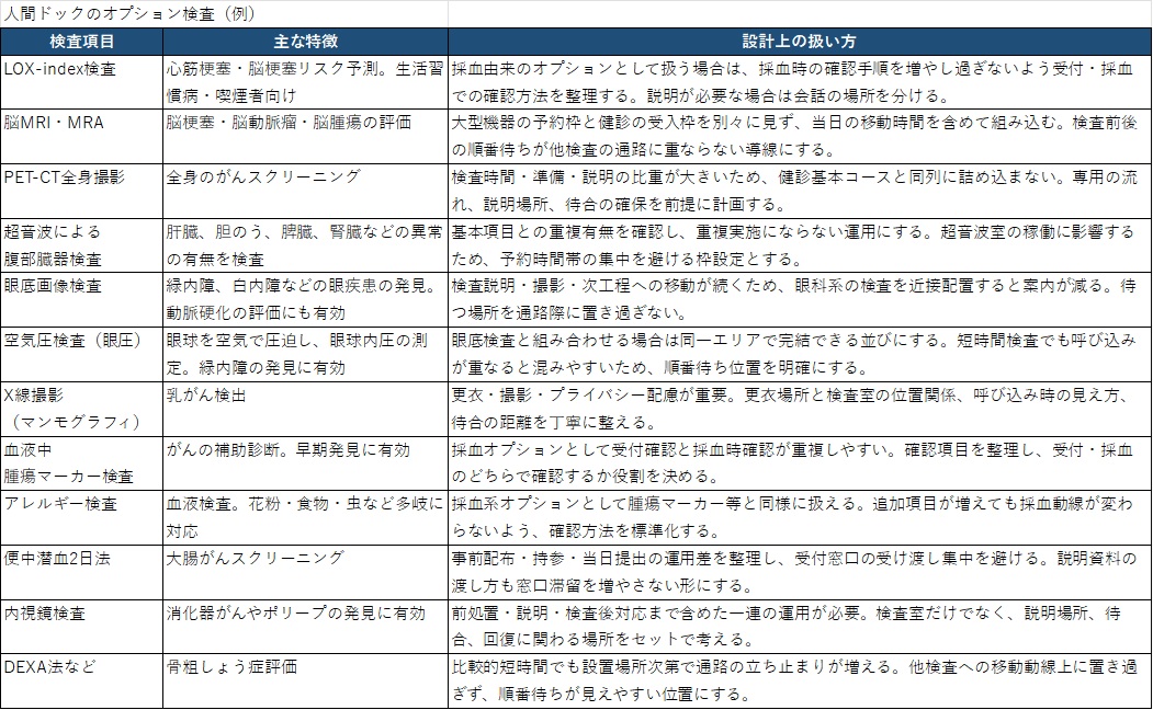 追加検査が入るたびに別ルートへ誘導する考え方では、案内や呼び込みが増え、運営が複雑になります。設計では、基本コースを土台にしながら、追加検査を組み込んだ流れをあらかじめ整理しておくことが重要です。