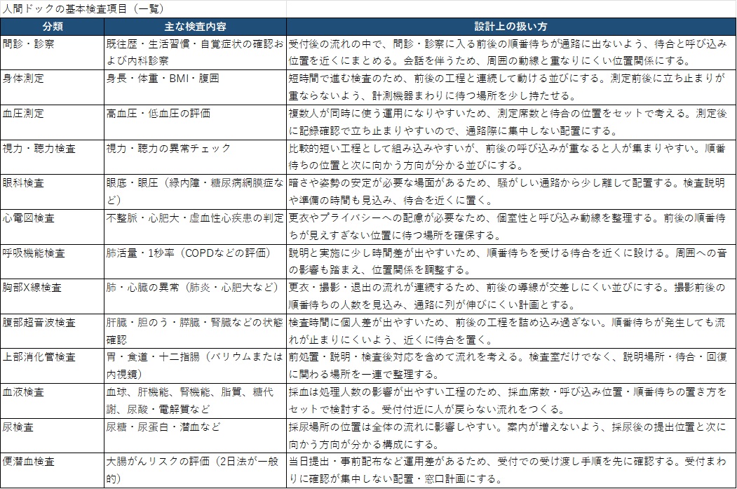 任意健診で難しくなるのは、検査が増えることより、特定の検査の前で順番待ちが集中しやすくなることです。そこで設計では、追加されやすい検査の前後に、待合や待つ場所をどう置くかを先に考えます。