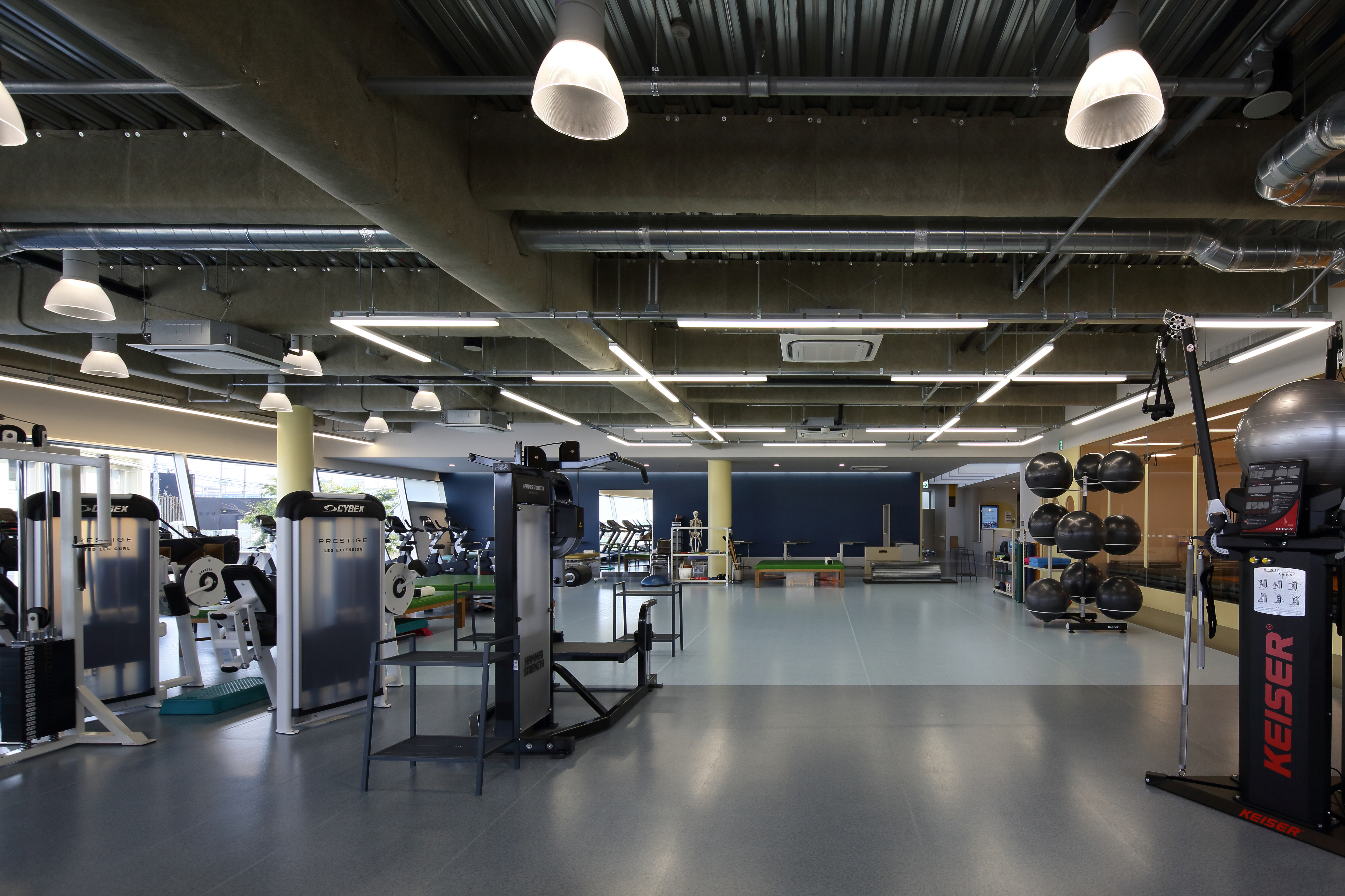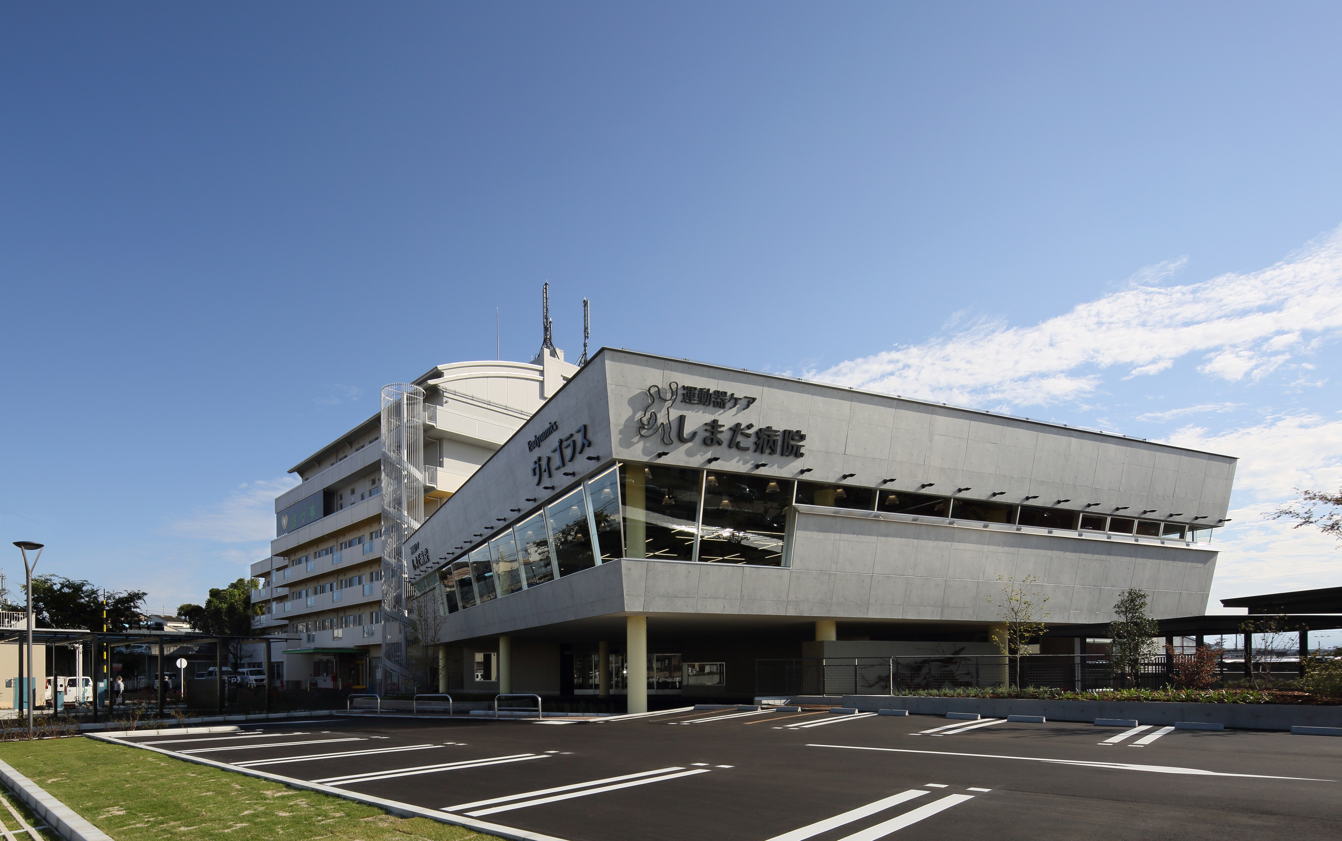 メディカルフィットネス「疾病予防運動施設(医療法42条施設)」は、 2002年健康増進法制定により、疾病予防のために有酸素運動を行う施設として医療法の付帯業務の1つに位置づけられました。しまだ病院は、スポーツ整形で先進の医療とスポーツ選手へのサポートを継続的に力を注がれており2003年8月に疾病予防施設「はびきのヴィゴラス」を開設されています。新病院建設では、運動器ケアに特化し、術後のリハビリやスポーツ選手へのサポートのために病院の新たな顔として「ヴィゴラス」の機能を拡充しました。有酸素運動エリアやマシンエリアのほかに鏡張りのスタジオも整備されています。地階には投球フォームのチェックやゴルフスイングチェック等も可能は広い屋内運動スペースが設けられています。