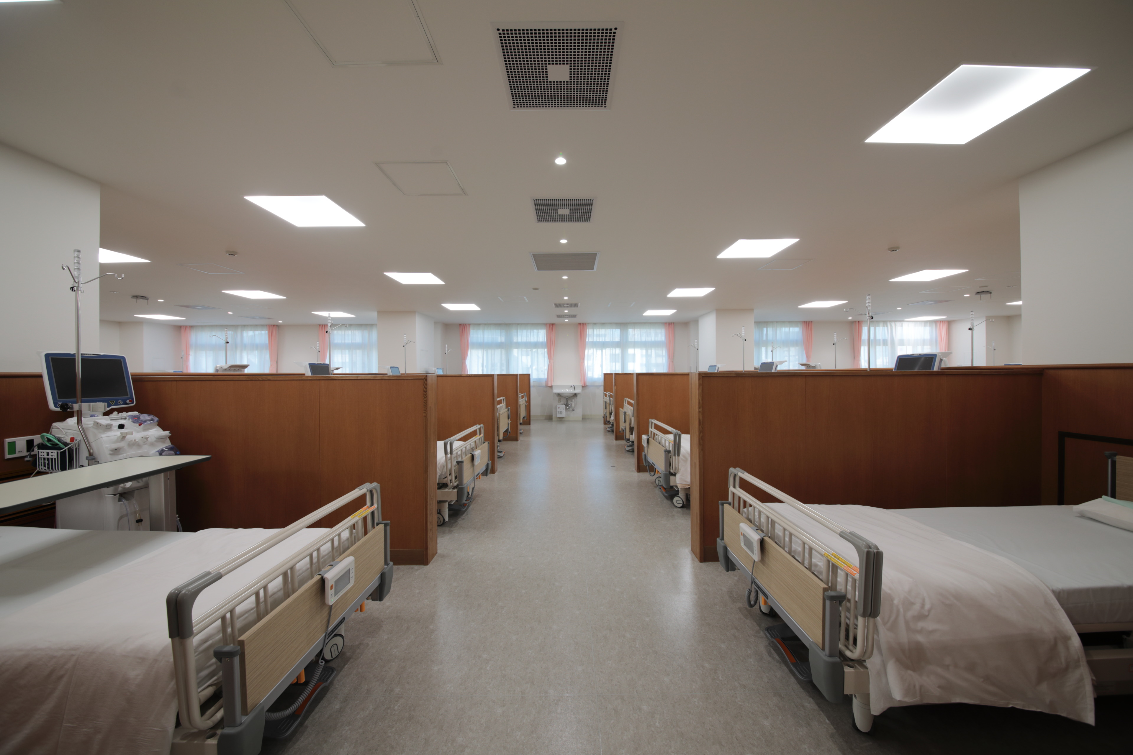 近隣に透析病院があったため既存病院では透析ベッドは9床で運営されていました。法人では透析患者への治療環境の充実を図るため建替えを期に透析ベッドを20床に拡張しました。また新病院では患者の送迎も始められました。透析室は病棟エリアと切り離し約16mを無柱の大スパンで計画(右写真の左側 茶色のタイル張り部分)し、スタッフステーションから患者の状態が見渡せる設計になっています。低風速で患者にやさしい「ゆう設計空調」を採用し、快適な透析治療空間となっています。感染対策個室も準備しており廊下から直接入室が可能な計画となっています。