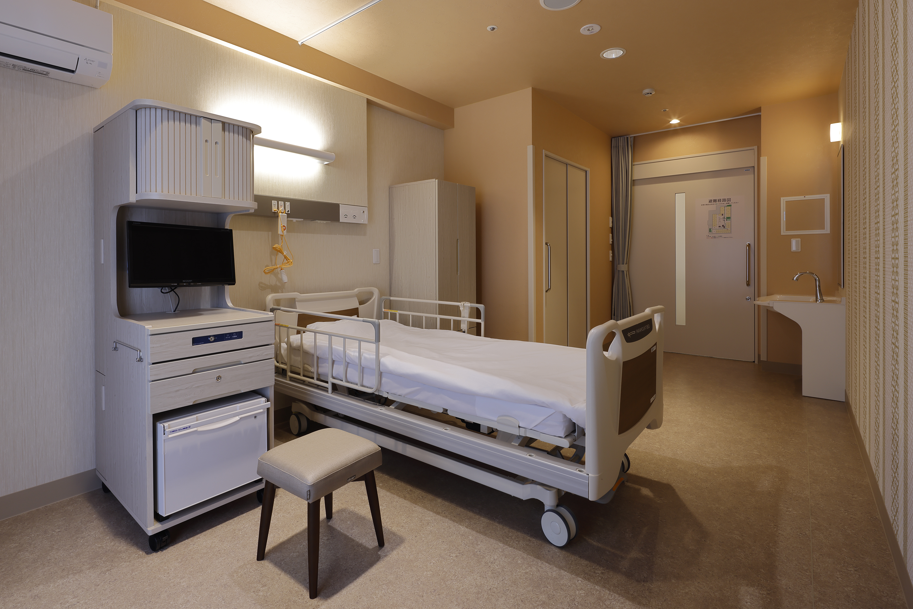 二期工事で建設した建物2階部分を住宅型有料老人ホームとして整備しました。有料老人ホーム専用のエントランスと階段・エレベーターを設置しています。また入居者用の食堂談話室も整備しました。有料老人ホームの基準は、病院の4床室の半分の面積にあたります。将来的に追加でベッド配分を受けることが可能になった際には、病室として転用が可能なように設備等の対応を行っています。法人は介護事業をすでに多数運営されているので入居対応もスムーズに行われています。安定期に入られた独居高齢患者の一時退院先としても活用も可能です。