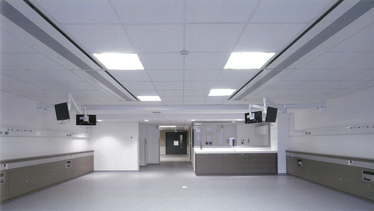 透析室の内観(12床のタイプで左側のガラス張りの部分は4床が個室になっています)
