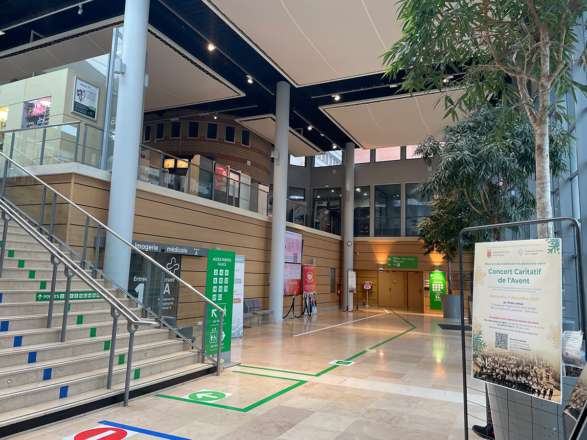 病院のエントランスホール(青と緑とサイン計画で病棟や外来などの動線を誘導)