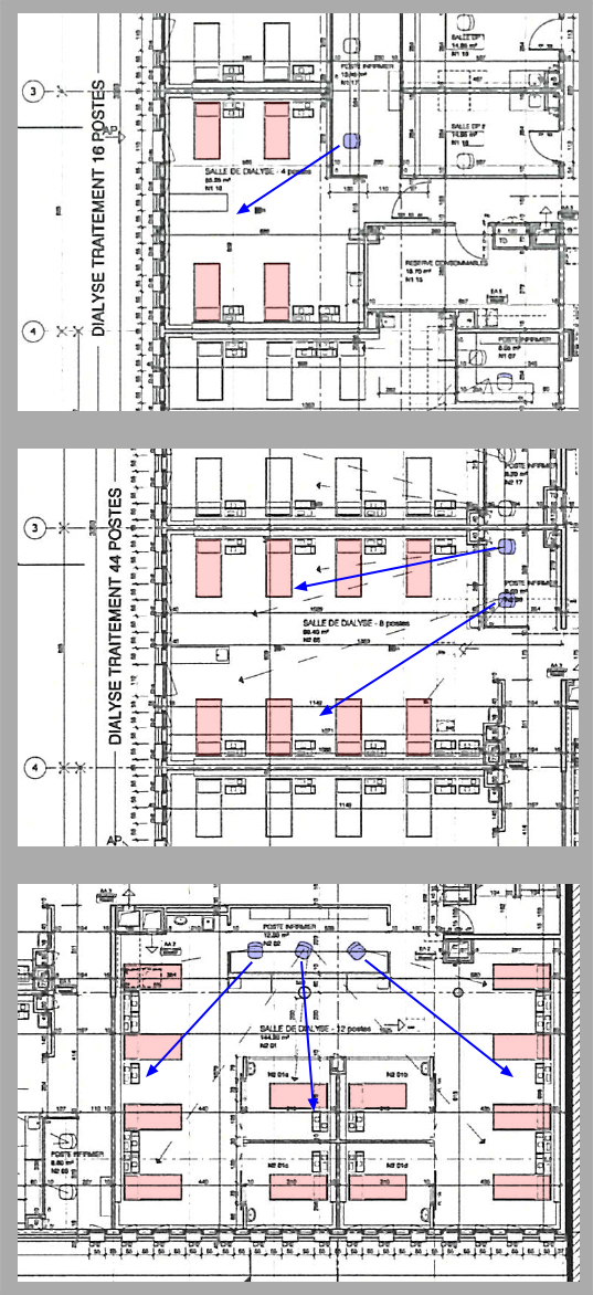3タイプの透析室(上から4床、8床、12床の透析室)