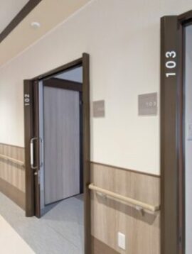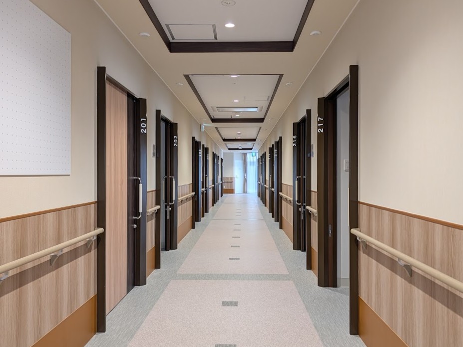 廊下の両側に居室が並んだ場合、どうしても居室サイン(部屋番号)の視認性が低くなります。ホテルのように部屋の出入口部分に凹凸をつけ部屋番号をわかりやすくすることができればいいなと思いながらも限られた敷地を効率よく活用するためにはまっすぐな廊下にせざるを得ませんでした。高齢者の施設では廊下には手すりが設けられます。その出幅をうまく利用して通行の妨げにならない出幅で扉の枠を工夫しました。枠の出幅を大きくし、かつ斜めに製作し枠に部屋番号を表示することで、壁面に設けるサインよりも視認しやすくなったと思います。