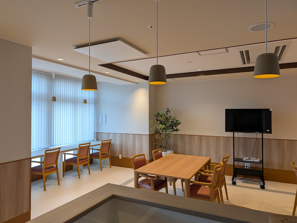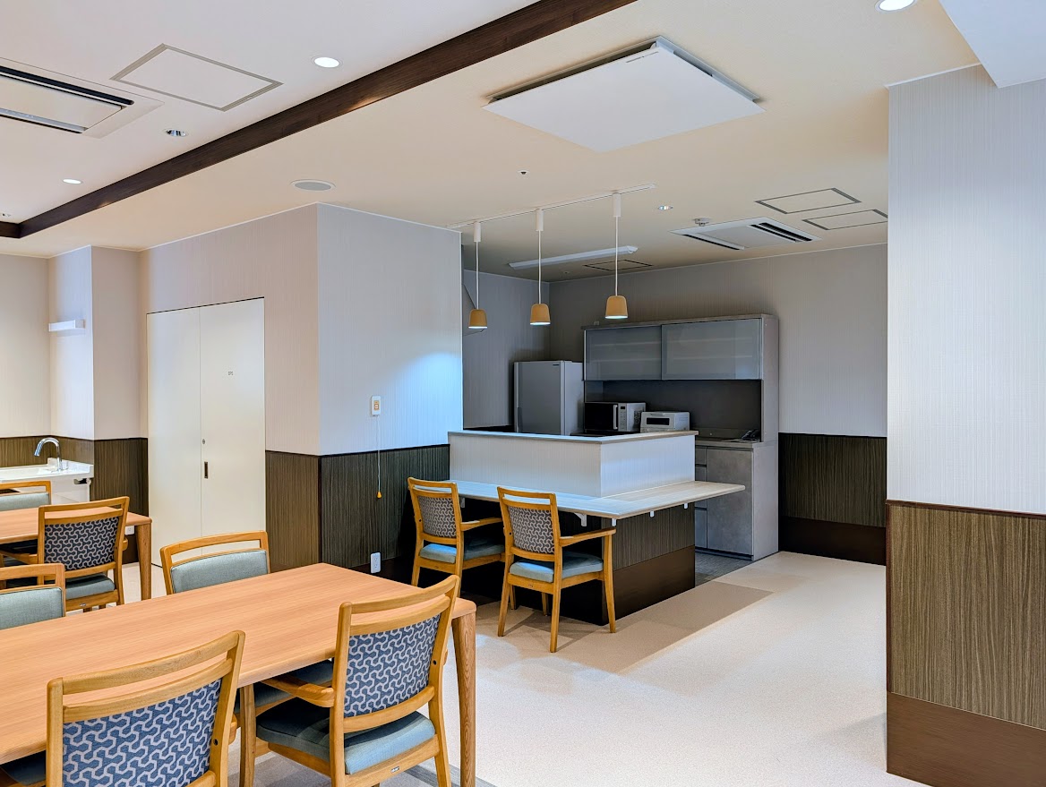 サービス付き高齢者向け住宅に入居される方は、比較的自立度の高い方を想定していますが、いずれ介護支援が必要になることにも配慮し、1階に仰臥位浴、2階に座位浴、3階に介護用一般個浴を設けています。要介護になった場合でも施設内で、入浴サービス提供が可能な計画としています。  食事については、法人が運営する給食センターから配食される食事を提供するため施設内の厨房は一時保管的な役割になっています。 居室は18㎡とし、各居室にはトイレと洗面、収納が設けられています。入居者は、併設される「定期巡回随時対応型訪問看護介護事業所」「訪問看護事業所」「訪問介護事業所」と個別に契約を行うことで個々の必要なサービスの提供を受けることができます。スーパーへの買い物や公園への散歩も自由に行うことが可能です。