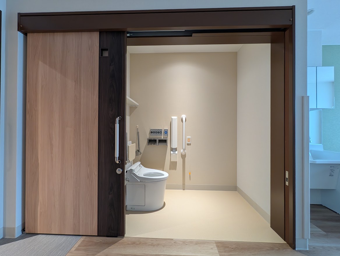 サービス付き高齢者の入居者は、入居時は比較的自立度の高い方が多いですが、昨今入居時の年齢が高い方が多く、短期間で車椅子の利用が必要になるケースも多いため、手洗いの位置や車いすでのトイレ移動、排泄介助等を想定し、いくつかのパターンを検討しました。同法人のハーベストコート3号館(弊社HP掲載参照)では、居室の間口が3.6mと広く取れたので「居室B2タイプ」を採用しましたが、今回は、限られた敷地にできるだけ多くの居室を配置するために居室の間口が3.0mと少し狭くなったため入口周りの車椅子での利用を検討した結果「居室A1タイプ」を採用しました。トイレの扉を2枚引戸にし、トイレの後ろに収納を設け、収納部分まで扉を開くことができるようにすることで、トイレの横からの介助が可能な開口幅が取れるようにしました。普段は引戸を1枚引くことで利用できます。利用頻度の高い手洗いの位置は、出入口近くよりもベッドから近いほうが良いとの判断となりました。